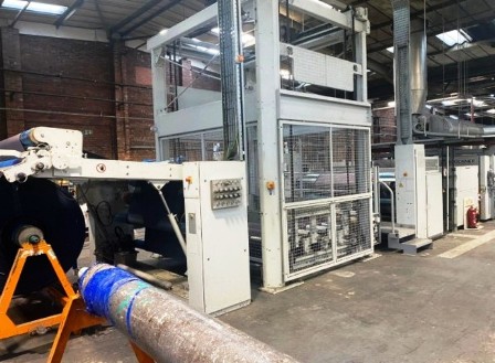 DOUBLE ENTRY FROM 2 A FRAME CENTRE UNWIND STATIONS ONE FINE TRIM COMPENSATOR INTO A 50 METRE ACCUMULATOR BIANCO CENTRALISING GUIDE OPERATORS PLATFORM COATING HEAD KNIFE OVER ROLLER, WITH AUTO FOAM GENERATOR BRUCKNER STENTER POWER FRAME TWIN AIR, SPLIT FLOW, TYPE TECHNO-LINE COATING MAX SPEED 60 MPMS TENTER ENTRY SECTION WITH PLEVA WEIGHT CONTROL AND BRUCKNER OPTI FRAME CONTROL E+L GUIDER SYSTEM VERTICAL PIN CHAIN 8 Chambers NARTURALGAS HEATING CHAMBERS MAX TEMP 210 MAXON GASBURNERS EXAUST AIR VOLUME 18000 m3 PER HOUR. EXIT WITH COOLING ZONE OPERATORS PLATFORM CENTRALISING GUIDER AND 30 METRE ACCUMULATOR TAKE OFF BY CENTRE WINDOR SURFACE BATCHING ARM ON TO A FRAMES 1600 MM DIA. We also supply new and used spare parts for textile machinery, including all types of rollers, motors and gearboxes etc With complete